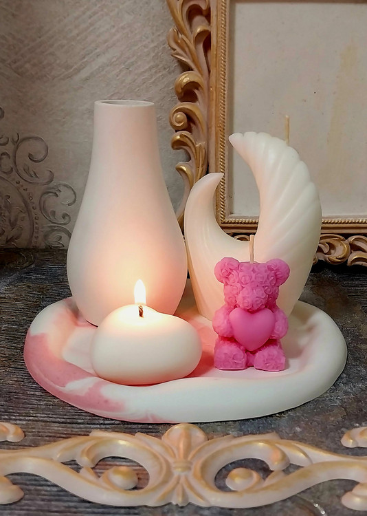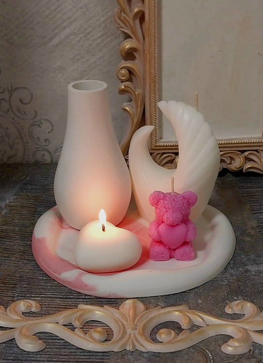 ست دکوری شامل سینی دفرمه، گلدان مدل خمره، شمع تزئینی مدل دانهیل و تدی و قلب