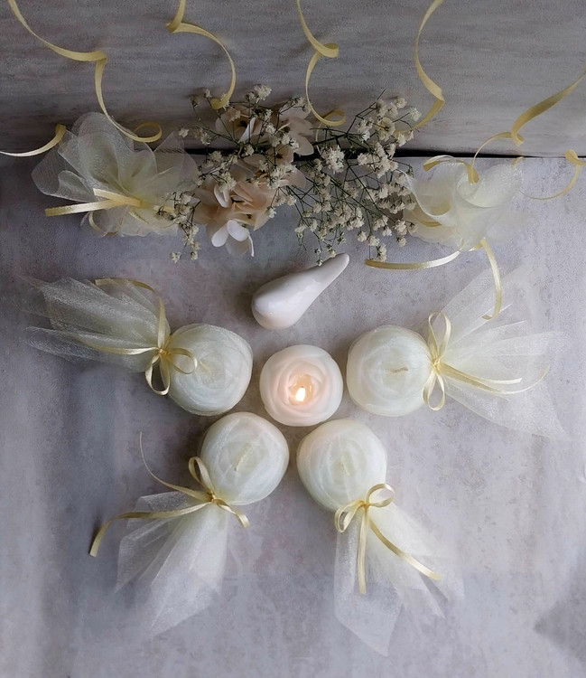 گیفت عقد و عروسی مدل پیونی با تور و روبان رنگ نباتی پک ۵۰ عددی