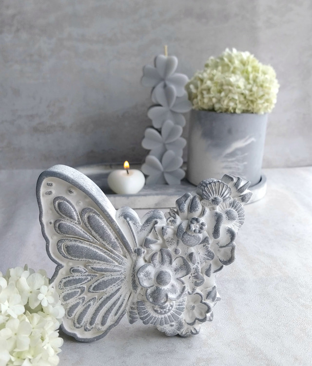 ست دکوری شامل سینی، گلدان، تندیس پروانه و شمع مدلهای شبدر، گوی ساحل، و قلب میباشد.