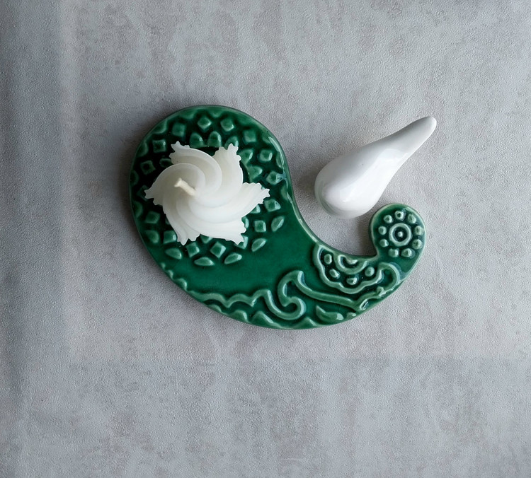 ست دکوری شامل دیوارکوب مشبک سرامیکی، زیری سرامیکی مدل بته جقه، تندیس سمازن و مرغ آمین، شمع تزئینی مدل پیچ مخروطی