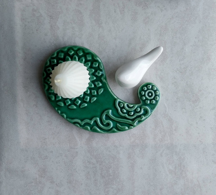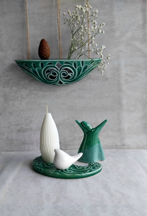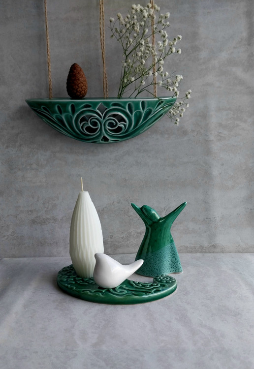 ست دکوری شامل دیوارکوب سرامیکی، زیری مدل بته جقه، تندیس سمازن، مرغ آمین و شمع تزئینی مدل خمره