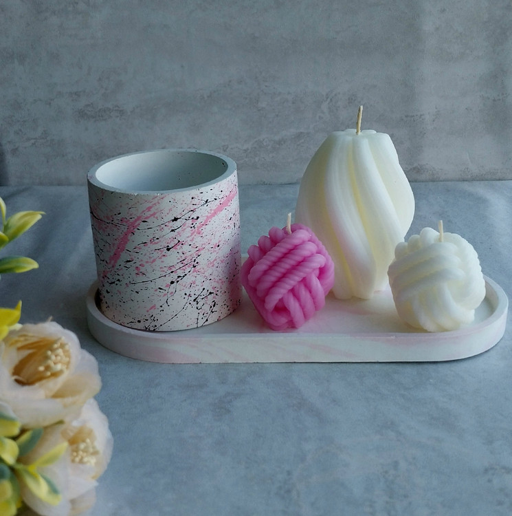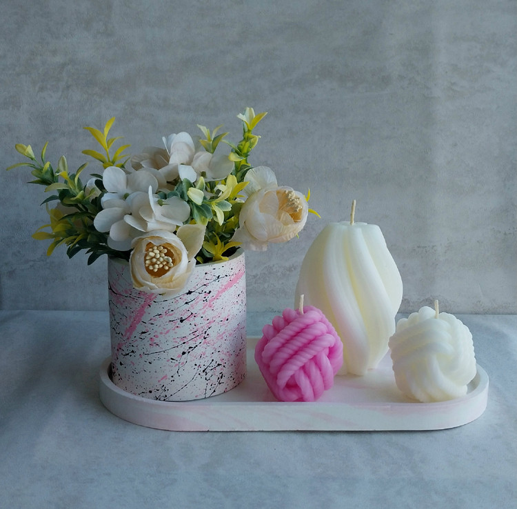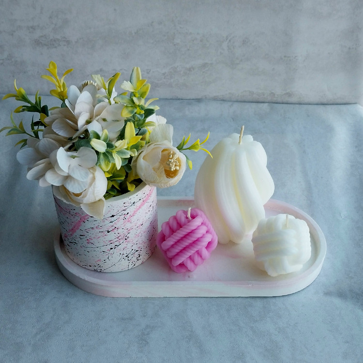 ست دکوری شامل سینی بیضی، گلدان استوانه، شمع تزئینی مدل گوی ساحل و کاموا