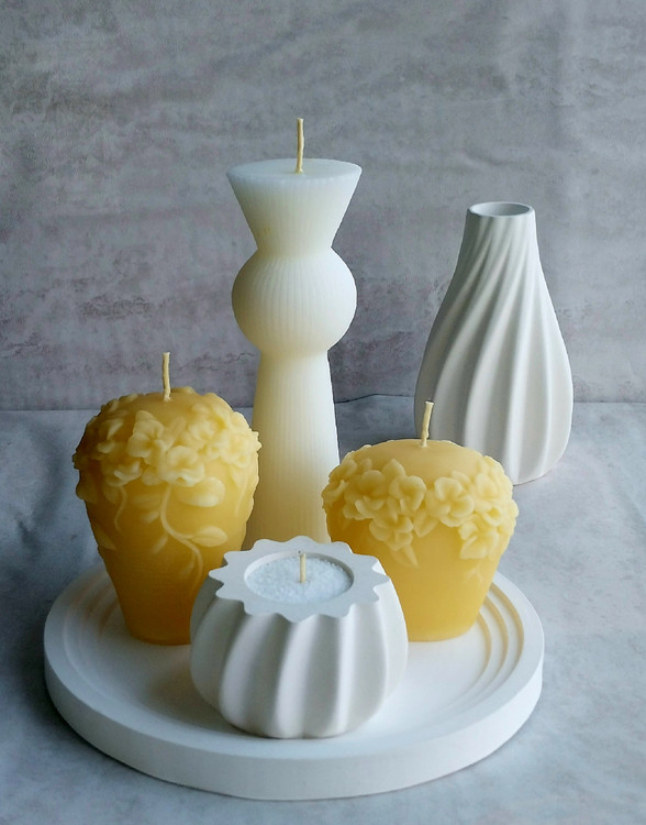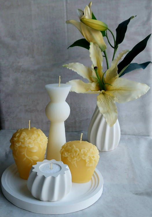 ست دکوری شامل سینی، گلدان، جا وارمری، و ۳ عدد شمع ژورنالی مدل استوانه توپی و باغ مارسلا میباشد.