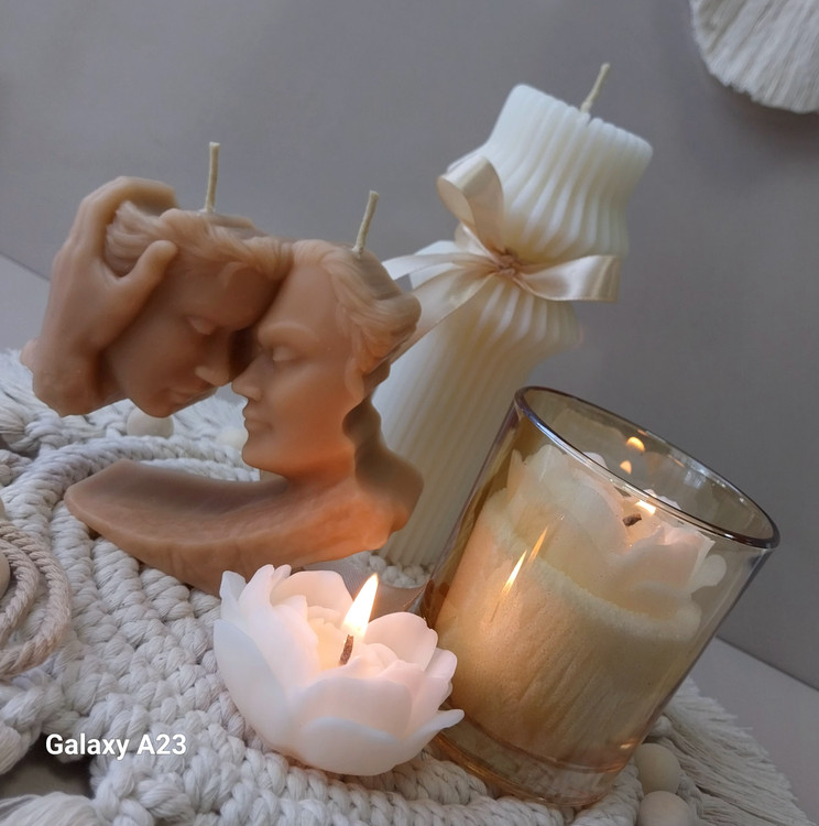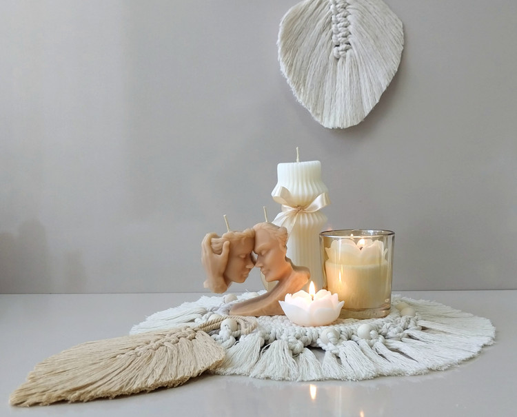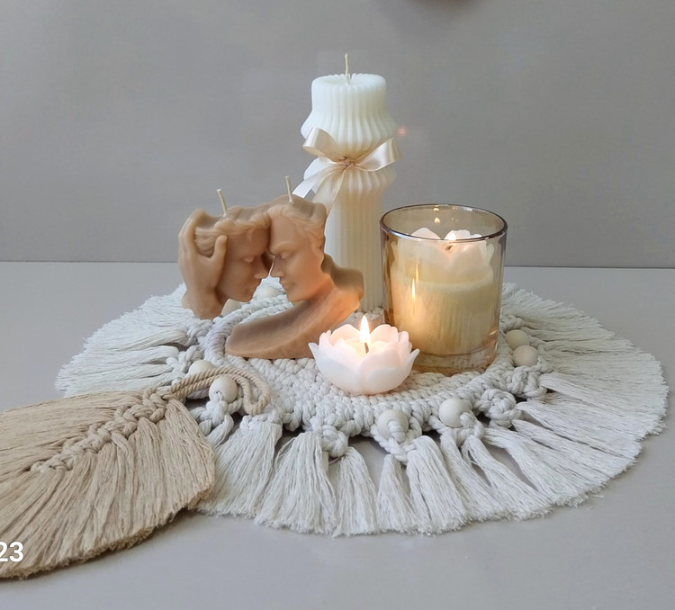 ست دکوری جلو مبلی با رانر مکرومه بافی و شمع ژورنالی رومئو و ژولیت