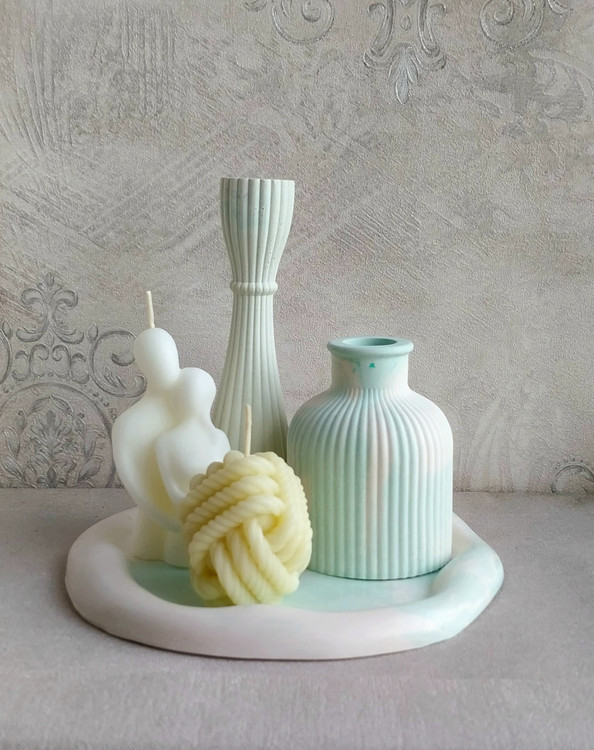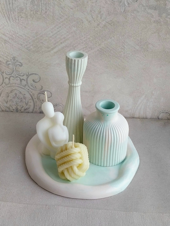 ست شامل سینی دفرمه، گلدان مدل مراکشی، شمعدان شیاردار، شمع مدل آغوش، شمع مدل کاموا