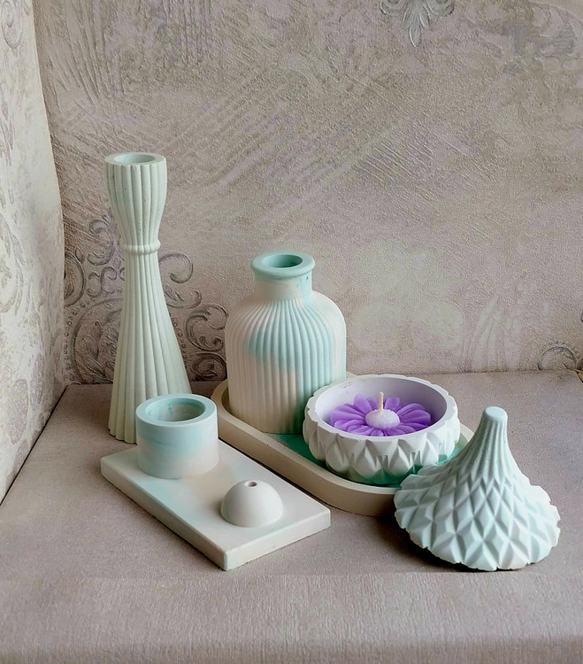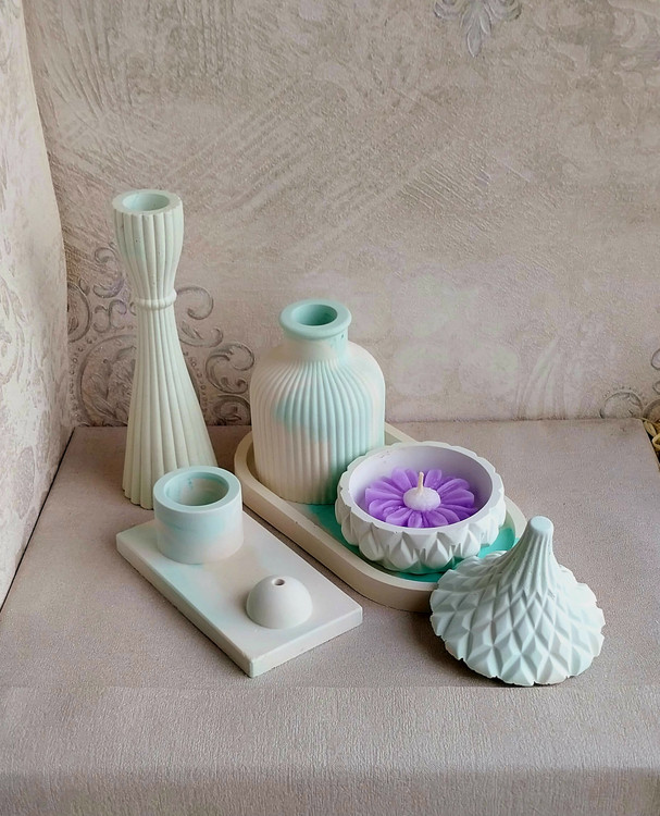 ست شامل سینی بیضی، گلدان مدل مراکشی، شمعدان شیاردار، شات شمع معطر، جاعودی